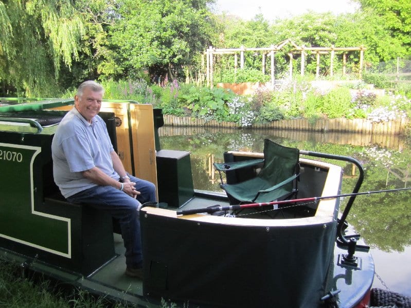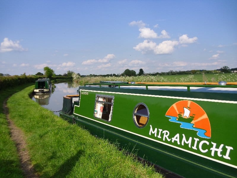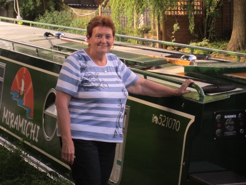 Jean Blanchard standing beside their narrowboat, “Miramichi”, which they launched in 2013 at Crick near Northampton in the UK.