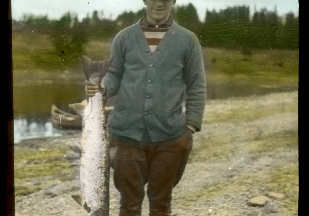 Young Charlie Wade with a well-mended Cains River kelt circa 1920. I believe this picture was taken near Black Brook at the mouth of the Cains River. Kelt fishing regularly continued until the end of May in those years, and the kelts mingled with early arriving...
