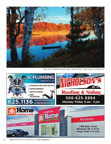 Fall colours reflected in the calm water in front of The Ledges in Doaktown. 54 Mighty Miramichi River Guide 2022/23 | www.riverguide.ca