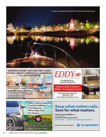 A night cruise past Ritchie Wharf. Photo by Darren McCormack 76 Mighty Miramichi River Guide 2023/24 | www.riverguide.ca